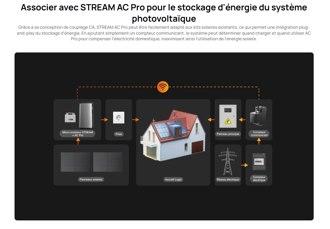 Connecté à une STREAM AC Pro, le compteur permet une compensation d’électricité intelligente via le couplage CA, sans réinjection au réseau et sans modification du câblage existant.